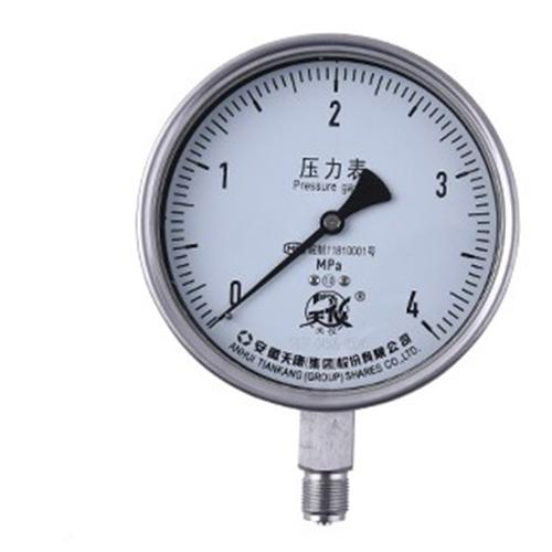 Anhui Tiankang Stainless Steel Pressure Gauge YB-60/YB-100/YB-150 consists of pressure guiding system (includingjoint, spring tube, etc.), gear drive system, indication device and shell. All the components are made of stainless steel. When the spring tube is under the pressure of the measured medium,corresponding elastic deformation will be produced on the pipe end, which is amplified by the gear drive mechanism and the measured pressure value is indicated by the indication device on the dial. The instrument shell is sealing structure which can protect effectively the internal parts from environmental influence and intrusion of filth. Meanwhile, filling oil into the shell is able to resist the pulsation of the measured medium pressure and influence of abrupt vibration of working environment,considering both the resistance to the corrosion and shock.