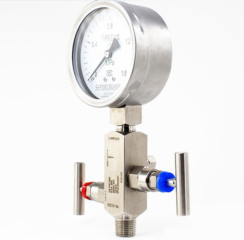 The pressure gauge two-valve group is mainly composed of a pressure gauge, an inlet valve and an outlet valve. Among them, the inlet valve and the outlet valve are connected to the measured pressure source and the measured pressure port respectively. The pressure gauge is located between the inlet valve and the outlet valve, with pipes connecting them both. The inlet valve is generally a straight-through ball valve, and the outlet valve is a tilting plunger ball valve.